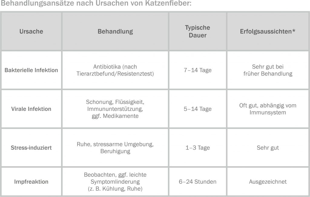 Bei sehr hohem Fieber über 40,5 °C kommen unter tierärztlicher Aufsicht fiebersenkende Mittel dazu. Oft sind auch Infusionen nötig, weil fiebernde Katzen schnell austrocknen.
