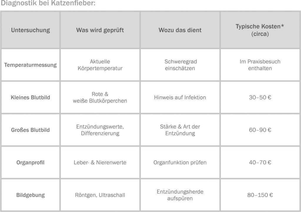 Oft werden zusätzlich Blutwerte und Urin gecheckt, manchmal werden auch Röntgen- oder Ultraschallbilder angefertigt. Bei Fieber unbekannter Ursache wird meist schrittweise vorgegangen: Zuerst werden die Laborwerte untersucht, dann folgt die Bildgebung und anschließend werden weitere Spezialtests durchgeführt. So lässt sich das Risiko vermeiden, dass wichtige Ursachen übersehen werden und Deine Samtpfote durch die Untersuchungen unnötig belastet wird.