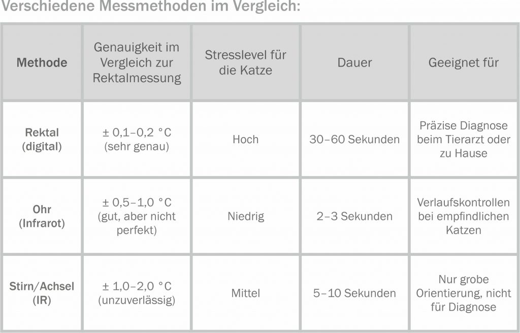 Der Nachteil: Sie können um 0,5–1 °C danebenliegen. Für regelmäßige Kontrollmessungen bei chronisch kranken Katzen sind sie jedoch eine praktische Option.