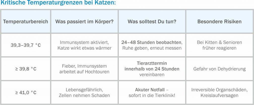 Temperaturen von 39,3 bis 39,7 °C gelten bei Katzen als leicht erhöht, ab 39,8 °C spricht man von Fieber. Temperaturen von 40,0–40,5 °C gelten als sehr hohes Fieber. Ein Notfall liegt bei Katzen ab einer Körpertemperatur von 41,0 °C vor.