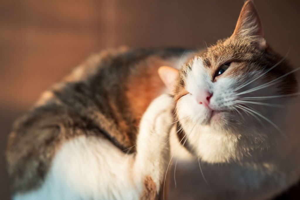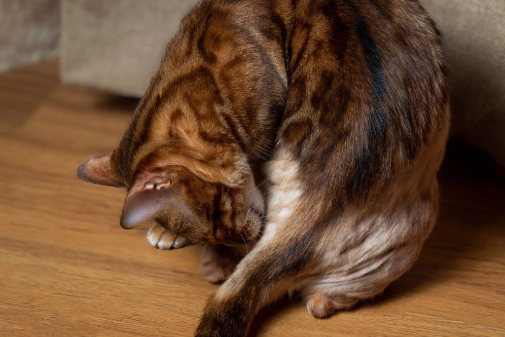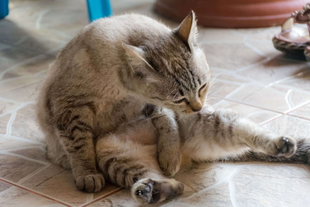 Starker Juckreiz führt dazu, dass die Katze sich häufig kratzt, leckt oder an Gegenständen reibt – sie findet keine Ruhe.