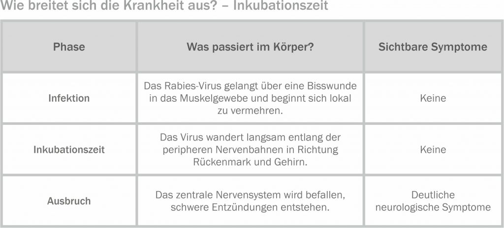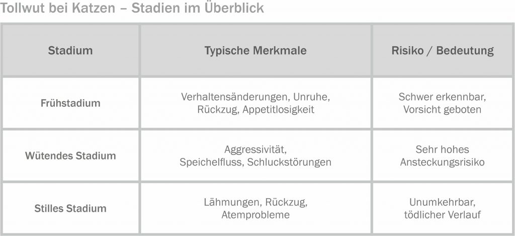 Der Krankheitsverlauf der Tollwut verläuft in mehreren Stadien, die sich hinsichtlich Symptomen, Risiko und Verlauf deutlich unterscheiden. Die folgende Übersicht zeigt die typischen Phasen und ihre Bedeutung für Mensch und Tier: